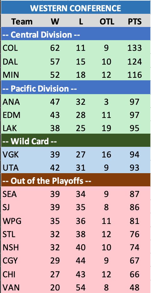 Anaheim Currently: The ducks are precariously sitting at top the Crazy Pacific division. Only one point ahead of Vegas only two points ahead of Edmonton four points ahead of LA five points ahead of San Jose who are out of the playoffs, but have two games in hand on the Ducks.